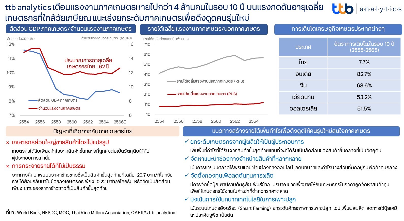 ศูนย์วิเคราะห์เศรษฐกิจ ทีทีบี หรือ ttb analytics มองภาคเกษตรไทยติดหล่มการพัฒนาจากข้อจำกัดในการสร้างมูลค่าเพิ่มทำให้มีรายได้และกำไรไม่เพียงพอในการเพิ่มประสิทธิภาพการผลิต ส่งผลให้รายได้เฉลี่ยภาคเกษตรต่ำกว่านอกภาคการเกษตรอย่างมีนัยสำคัญ มีสิ่งชักจูงให้คนรุ่นใหม่ละทิ้งภาคเกษตรในขณะที่แรงงานเกษตรในปัจจุบันมีอายุเฉลี่ยสูงที่ใกล้ออกจากตลาดแรงงานเพิ่มมากขึ้น แนะรัฐและเอกชนร่วมมือยกระดับเศรษฐกิจเกษตรไทยให้มีรายได้และคุณภาพชีวิตที่ดีขึ้น เพื่อดึงดูดคนรุ่นใหม่ให้ยังมีความต้องการในการทำงานในภาคเกษตรก่อนจะสายเกินไป