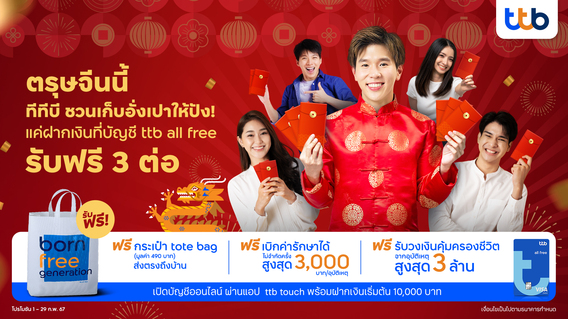 ทีทีบี จัดแคมเปญพิเศษต้อนรับเทศกาลตรุษจีน ให้ลูกค้ามีชีวิตทางการเงินที่ดี ทั้งวันนี้และอนาคต ชวนลูกค้าบัญชีเงินฝากมาเพิ่มหลักประกันให้ชีวิตแบบฟรีๆ ด้วยการนำอั่งเปาที่ได้รับในช่วงเทศกาลตรุษจีน มาเปิดบัญชีเงินฝาก ttb all free ผ่านแอป ttb touch พร้อมฝากเงินเริ่มต้น 10,000 บาท และคงเงินฝากไว้ในบัญชีตลอดทั้งเดือน ตั้งแต่ 1–29 กุมภาพันธ์ 2567 นี้ รับฟรีทันที 3 ต่อ ดังนี้