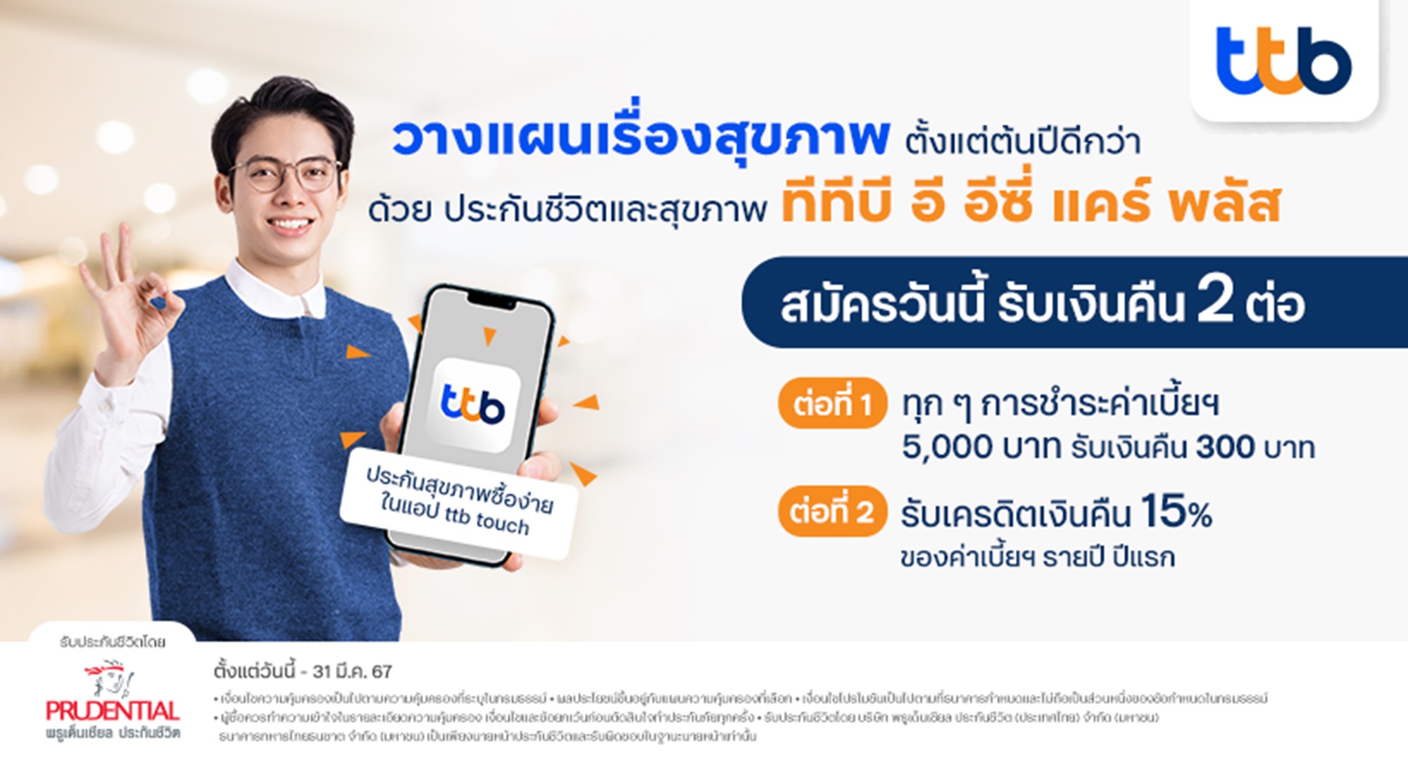 ทีทีบี ชวนลูกค้าวางแผนเรื่องสุขภาพตั้งแต่ต้นปี ผ่านแผนประกันชีวิตและสุขภาพ “ทีทีบี อี อีซี่ แคร์ พลัส” จากพรูเด็นเชียลประกันชีวิต ผลิตภัณฑ์ประกันชีวิตและสุขภาพแบบเหมาจ่าย ครบ จบทุกการรักษา จ่ายค่าเบี้ยสบายกระเป๋า เพียง 31 บาทต่อวัน* และสามารถนำเบี้ยประกันฯ ไปลดหย่อนภาษีได้ สูงสุด 25,000 บาท สมัครวันนี้ รับเงินคืน 2 ต่อ โปรโมชันตั้งแต่วันนี้–31 มีนาคม 2567