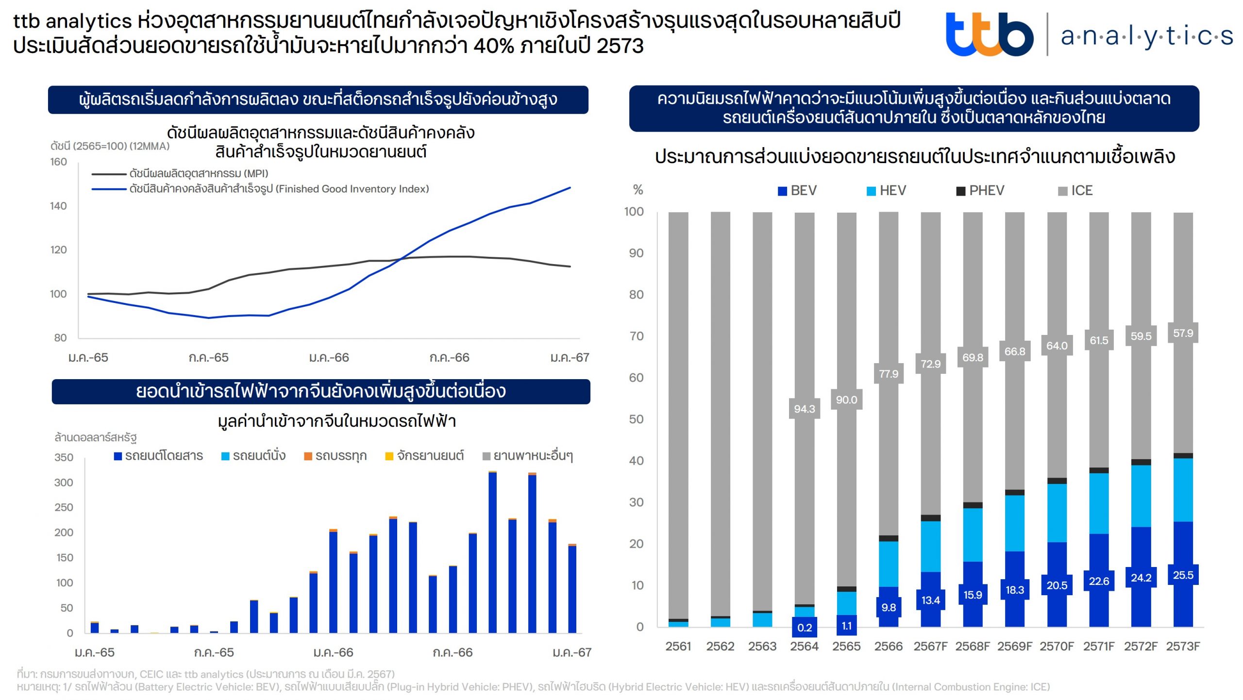ศูนย์วิเคราะห์เศรษฐกิจ ทีทีบี หรือ ttb analytics มองเทรนด์การใช้รถยนต์ไฟฟ้า (BEV) ของไทยในระยะต่อไปจะยังคงเพิ่มขึ้นต่อเนื่อง และจะส่งผลให้ส่วนแบ่งยอดขายรถยนต์ที่เป็นเครื่องยนต์สันดาปภายใน (ICE) ทยอยลดลงจาก 77.9% ของยอดขายทั้งหมดในปี 2566 เหลือเพียง 57.9% ภายในปี 2573 ซึ่งจะส่งผลกระทบต่ออุตสาหกรรมยานยนต์ไทยรุนแรงขึ้น เนื่องจากโครงสร้างอุตสาหกรรมการผลิตยานยนต์ไทยปรับตัวได้ช้า อีกทั้งไทยยังเสียเปรียบต้นทุนการผลิตรถในประเทศ ขณะที่การตั้งเป้าให้ไทยเป็นฐานผลิตรถยนต์ BEV ของอาเซียนอาจยังทำได้ไม่เต็มที่และเจอคู่แข่งจากประเทศเพื่อนบ้าน ยิ่งกว่านั้น บทบาทในห่วงโซ่อุปทานเทคโนโลยีแบตเตอรี่ไฟฟ้าของไทยค่อนข้างน้อยจากข้อจำกัดรอบด้าน