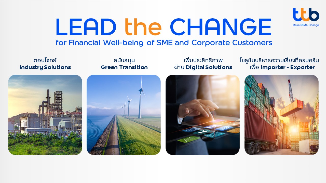 ทีทีบีตอกย้ำการเป็นธนาคารเพื่อความยั่งยืน ตามแนวคิด B+ESG พร้อมสนับสนุนลูกค้า คู่ค้า พันธมิตรทางธุรกิจ ให้สามารถดำเนินธุรกิจได้อย่างมั่นคงและยั่งยืน สามารถรับมือกับมาตรการทางการค้าที่หลายประเทศเริ่มนำมาใช้ เพื่อผลักดันให้ธุรกิจมีความรับผิดชอบต่อสิ่งแวดล้อมมากขึ้น รวมถึงกติกาใหม่ของประเทศไทยอย่าง Thailand Taxonomy และรวมถึง พรบ. การเปลี่ยนแปลงสภาพภูมิอากาศ (Climate Change) ซึ่งจะเกิดขึ้นเร็ว ๆ นี้ นอกจากนี้องค์กรใหญ่หลายแห่งก็ได้เริ่มกำหนดให้ซัพพลายเออร์และคู่ค้าต้องดำเนินธุรกิจโดยคำนึงถึงสิ่งแวดล้อมเช่นกัน หากไม่สามารถทำตามเกณฑ์ก็อาจสูญเสียโอกาสในการทำธุรกิจ หรือมีต้นทุนธุรกิจเพิ่มขึ้นได้