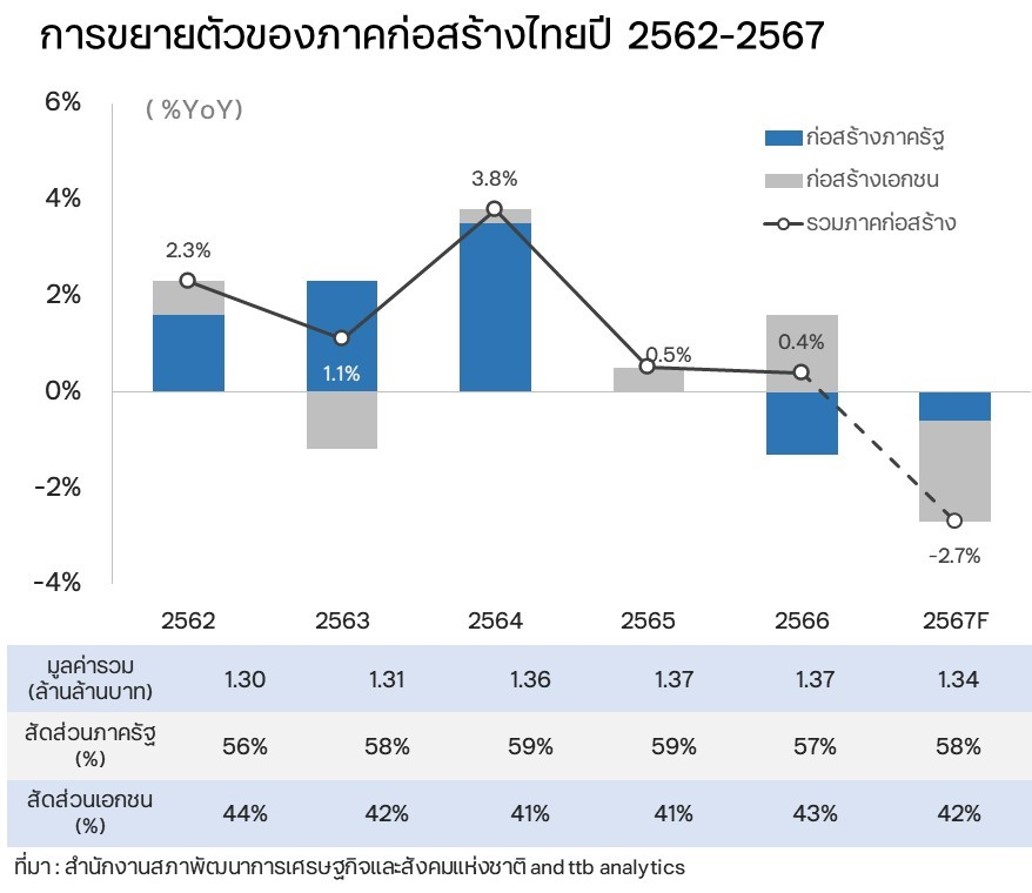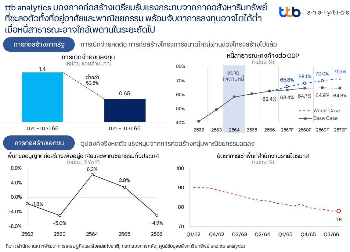 ศูนย์วิเคราะห์เศรษฐกิจ ทีทีบี หรือ ttb analytics มองอุตสาหกรรมก่อสร้างคาดชะลอตัวจากแรงหนุนที่หายไปจากภาคอสังหาริมทรัพย์ที่เป็นอุปสงค์จริงทั้งภาคที่อยู่อาศัย และพาณิชยกรรม รวมถึงงานก่อสร้างภาครัฐก็อาจไม่สดใสจากผลการเบิกจ่ายที่ล่าช้า และหนี้สาธารณะต่อจีดีพี ที่ใกล้เต็มเพดานจากการทำแผนงบประมาณขาดดุลต่อเนื่องถึงปี 2570