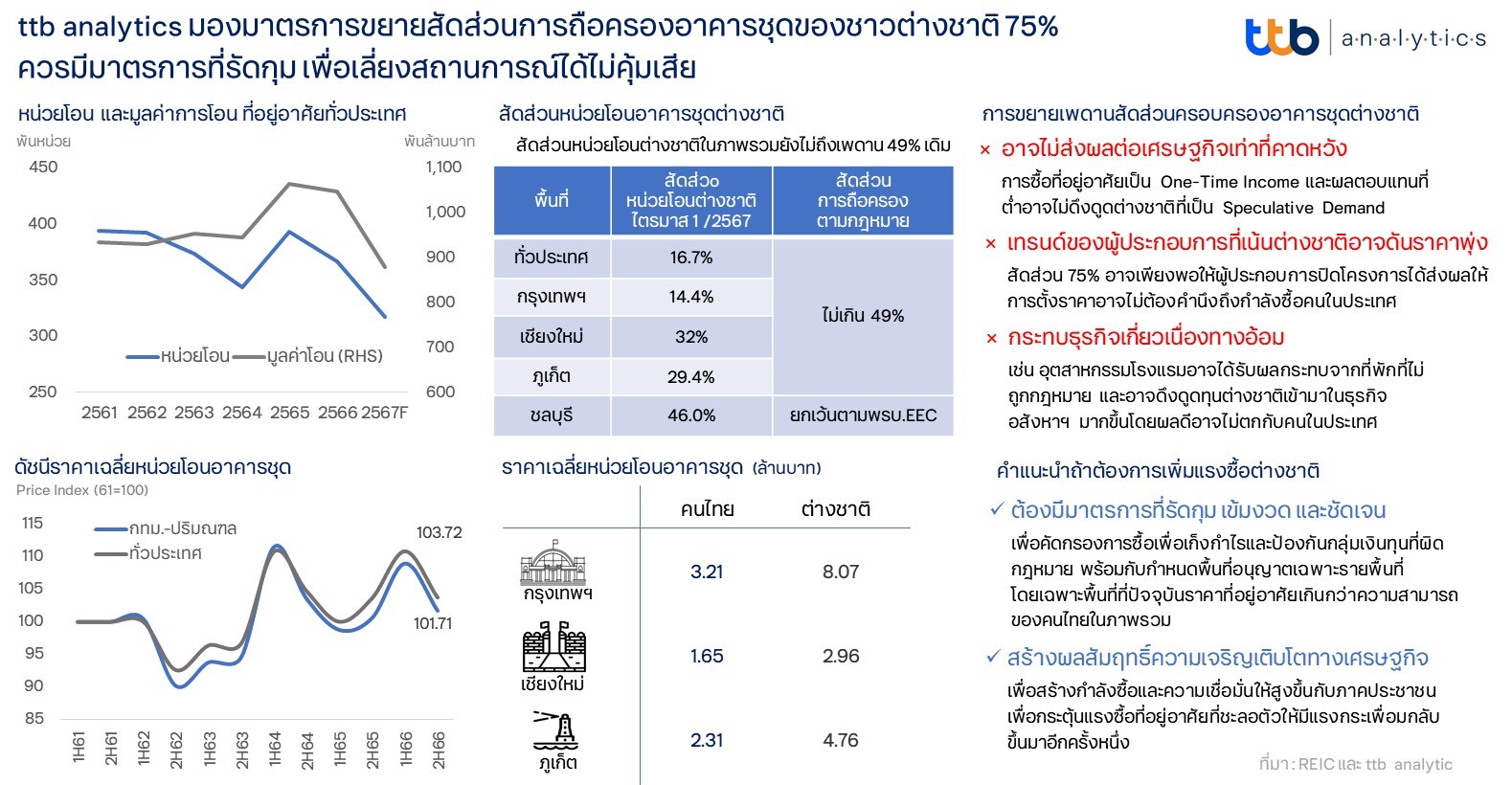 ศูนย์วิเคราะห์เศรษฐกิจ ทีทีบี หรือ ttb analytics มองมาตรการขยายการถือครองอาคารชุดของชาวต่างชาติเป็น 75% หากไม่รัดกุมผลที่ตามมาจะเป็นคลื่นที่ไม่รู้จบ (Unceasing Waves) ทั้งราคาที่ปรับเพิ่มสูงกว่ากำลังซื้อของคนในประเทศ และผลกระทบต่อธุรกิจที่เกี่ยวข้อง พร้อมแนะควรมีมาตรการที่รัดกุม เข้มงวด และมีความชัดเจน เพื่อหลีกเลี่ยงไม่ให้เกิดผลกระทบแก่คนรุ่นหลัง