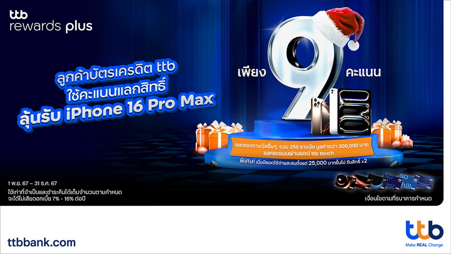ทีเอ็มบีธนชาต หรือ ทีทีบี มอบความสุขส่งท้ายปีสำหรับลูกค้าบัตรเครดิต ttb “ยิ่งแลก ยิ่งมีสิทธิ์ลุ้น ใช้คะแนนแลกสิทธิ์ลุ้นรางวัลใหญ่กับบัตรเครดิต ttb” เพียงแลกคะแนน ttb rewards plus 9 คะแนน รับ 1 สิทธิ์ ผ่านแอป ttb touch ลุ้นรับ iPhone 16 Pro Max 512GB และรางวัลอื่น ๆ รวมทั้งสิ้น 250 รางวัล มูลค่ารวมกว่า 300,000 บาท สำหรับลูกค้าบัตรเครดิต ttb ประเภทบัตรหลักที่มีคะแนนสะสม ประเภทบุคคลธรรมดาเท่านั้น