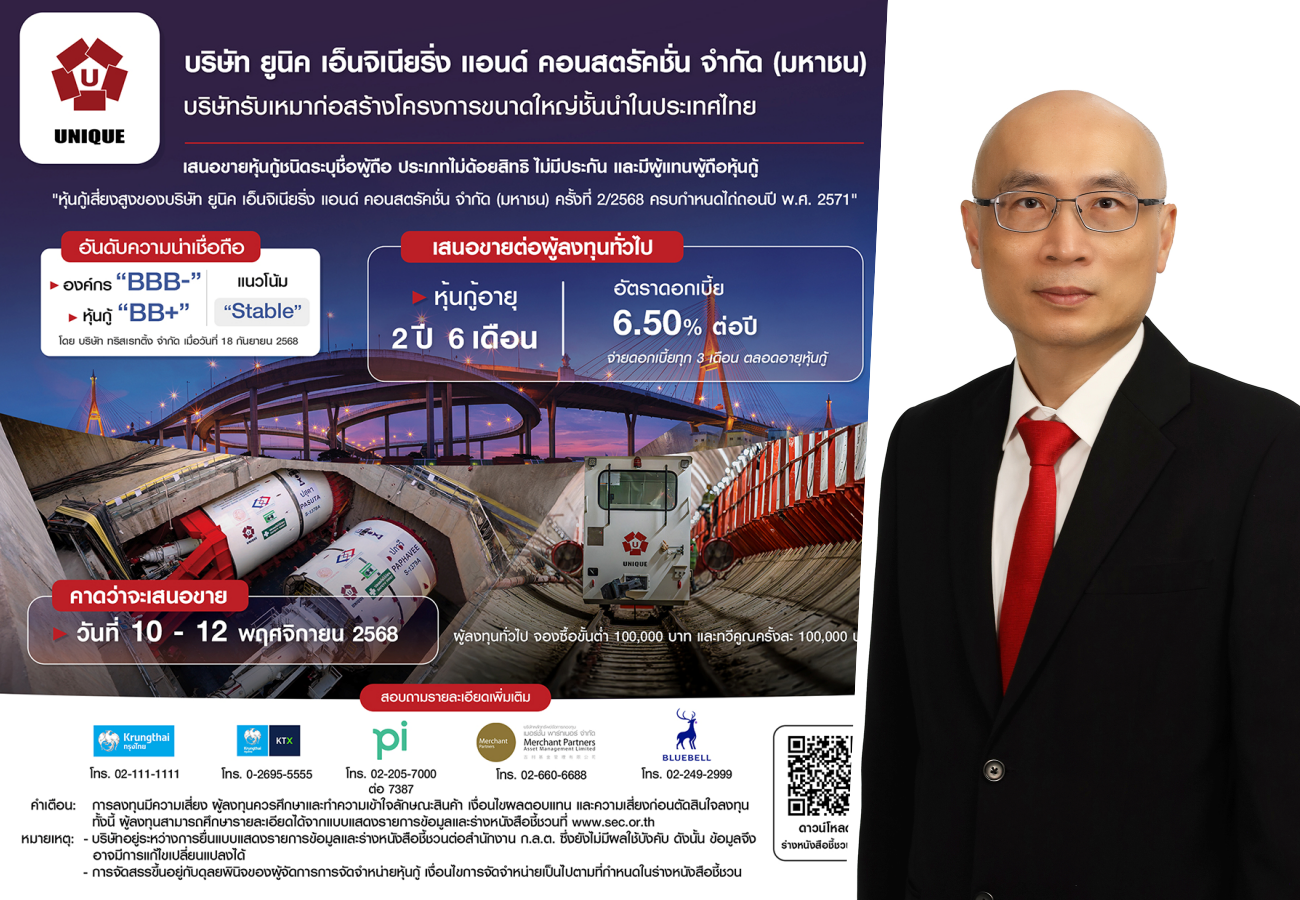 UNIQ เตรียมเสนอขายหุ้นกู้อายุ 2 ปี 6 เดือน อัตราดอกเบี้ย 6.50% ต่อปี ให้แก่ผู้ลงทุนทั่วไป คาดเสนอขายระหว่างวันที่ 10–12 พฤศจิกายน 2568 ผ่านสถาบันการเงิน 5 แห่งที่ได้รับแต่งตั้งเป็นผู้จัดการการจัดจำหน่ายหุ้นกู้ เผยหุ้นกู้ได้รับการจัดอันดับความน่าเชื่อถือจากทริสเรทติ้ง เมื่อวันที่ 18 กันยายน 2568 ที่ระดับ BB+ และอันดับความน่าเชื่อถือองค์กรที่ระดับ BBB- แนวโน้ม “Stable” (คงที่) สะท้อนความสามารถในการแข่งขันที่แข็งแกร่งในการรับงานก่อสร้างโครงสร้างพื้นฐานขนาดใหญ่ของภาครัฐ มั่นใจนักลงทุนให้การตอบรับ จากศักยภาพและโอกาสในการเติบโต ด้วยมูลค่างานในมือ (backlog) ของบริษัทฯ ณ วันที่ 30 มิถุนายน 2568 ที่ 37,677.03 ล้านบาท ซึ่งสามารถทยอยรับรู้รายได้จนถึงปี 2572 โดยในไตรมาสที่ 2 ปี 2568 บริษัทฯ มีกำไรสุทธิ 879.61 ล้านบาท พร้อมเดินหน้ารับงานใหม่ต่อเนื่อง