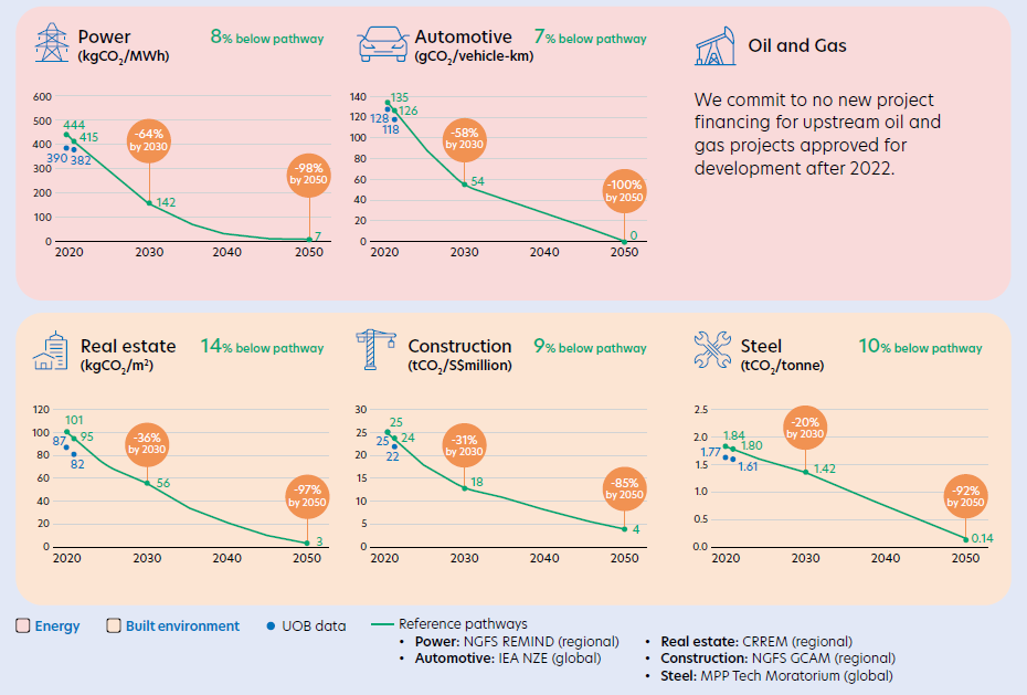 คำมั่นสัญญา Net Zero ของยูโอบีประกอบด้วยเป้าหมายการลดการปล่อยก๊าซเรือนกระจกสุทธิใน 5 ภาคอุตสาหกรรม ได้แก่ พลังงาน ยานยนต์ อสังหาริมทรัพย์ อุตสาหกรรมก่อสร้าง และเหล็กกล้า จากข้อมูลของธนาคาร ในปี 2565 ธนาคารยูโอบีสามารถลดความเข้มข้นการปล่อยก๊าซเรือนกระจก ด้วยตัวชี้วัดที่แตกต่างกันในทั้ง 5 ภาคอุตสาหกรรมได้ต่ำกว่าแนวทางการปลดปล่อยก๊าซเรือนกระจกสุทธิเป็นศูนย์ (net zero reference pathway) ร้อยละ 7 ถึง 14