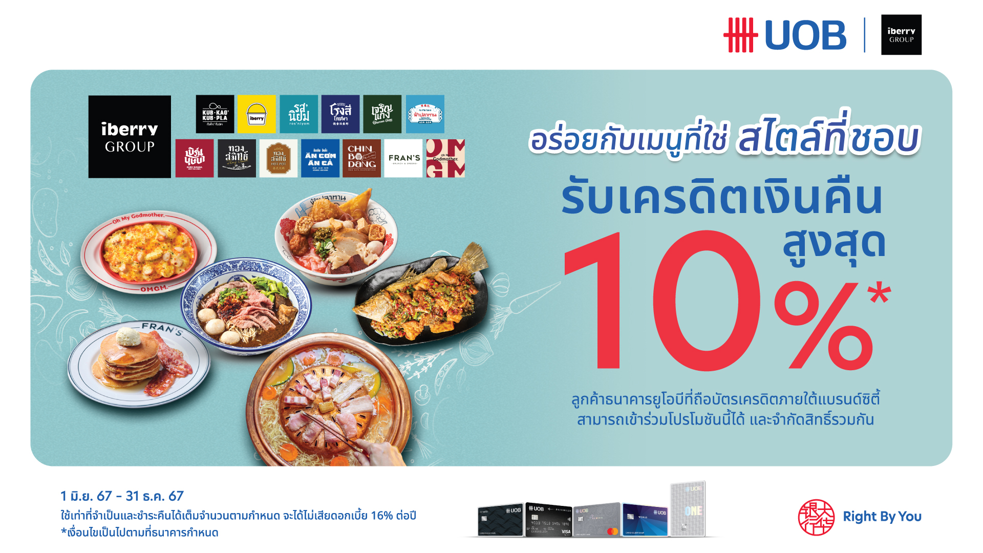 ธนาคารยูโอบี ประเทศไทย จับมือกับ iberry Group เครือร้านอาหารชื่อดัง เจ้าของแบรนด์ร้านอาหารหลากหลาย ได้แก่ กับข้าว’ กับปลา, iberry, รส’นิยม, โรงสีโภชนา, เจริญแกง, ฟ้าปลาทาน, เบิร์นบุษบา, ทองสมิทธิ์, ทองสมิทธิ์ Hotpot, อันเกิม อันก๋า, ชิ้นโบแดง, Fran’s และ OMGM จัดแคมเปญพิเศษ ชวนสายกินมาฟินทุกมื้อ อร่อยกับเมนูที่ใช่ สไตล์ที่ชอบ พร้อมรับเครดิตเงินคืน 10% ที่ร้านอาหารในเครือ iberry สำหรับลูกค้าบัตรเครดิตยูโอบี และบัตรเครดิต TMRW เมื่อรับประทานครบ 1,000 บาท ขึ้นไป/เซลส์สลิป ตั้งแต่วันนี้ – 31 ธันวาคม 2567