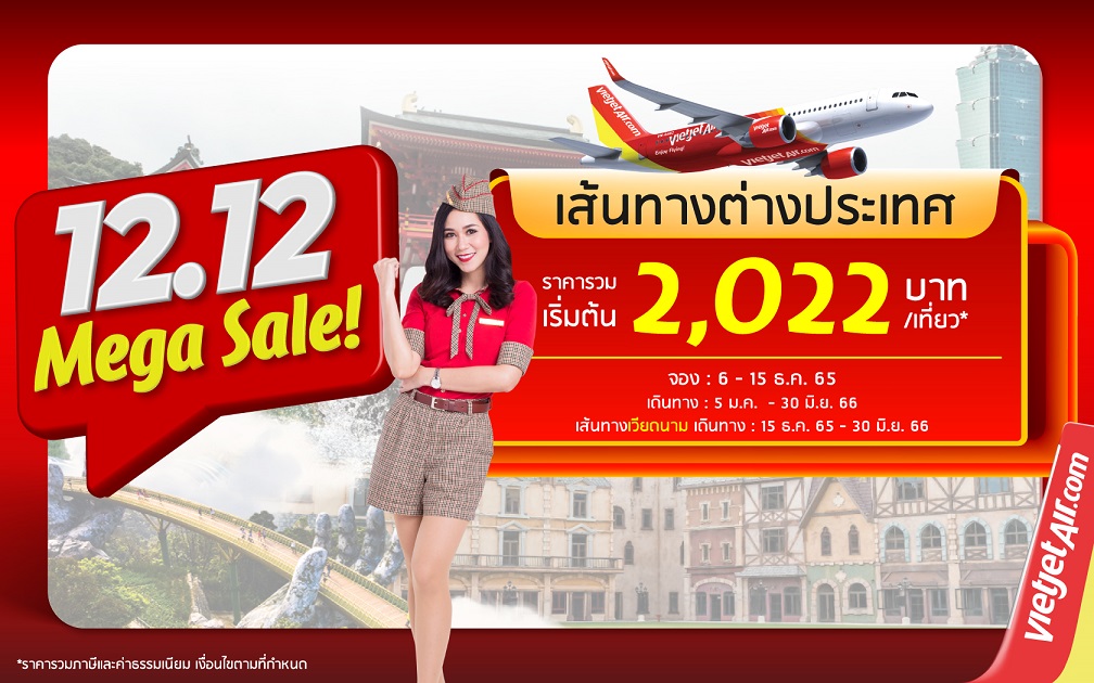 สายการบินไทยเวียตเจ็ทออกโปรโมชั่น “’12.12 บินสนุก สุขส่งท้าย (12.12 Mega Sale)” เสนอบัตรโดยสารราคาพิเศษ เริ่มต้นเพียง 2,022 บาท (ราคารวมภาษีและค่าธรรมเนียม) สำหรับเดินทางบนเส้นทางบินบนเครือข่ายเส้นทางบินระหว่างประเทศ ผู้โดยสารสามารถสำรองบัตรโดยสารได้ตั้งแต่วันนี้จนถึงวันที่ 15 ธันวาคม 2565 เดินทางได้ระหว่างวันที่ 15 ธันวาคม 2565 – 30 มิถุนายน 2566 (ยกเว้นวันหยุดนักขัตฤกษ์)