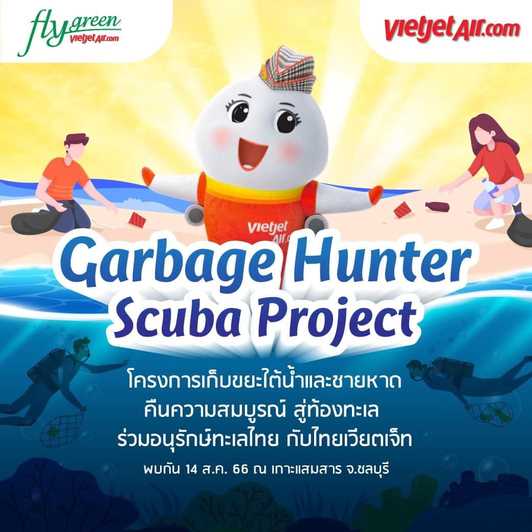 โครงการ ‘Garbage Hunter’ ก่อตั้งขึ้นเมื่อต้นปี พ.ศ. 2565 โดยมีภารกิจหลักในการกำจัดขยะจากสถานที่ต่างๆ ในประเทศไทย สร้างจิตสำนึกด้านสิ่งแวดล้อมแก่พนักงานและสมาชิกของสายการบินฯ รวมถึงขับเคลื่อนความตระหนักด้านความยั่งยืน มุ่งลดขยะและของเสียจากสิ่งแวดล้อม นับตั้งแต่ก่อตั้งโครงการ ไทยเวียตเจ็ทประสบความสำเร็จจากการจัดงาน ‘Garbage Hunter’ กว่า 10 ครั้ง ในหลายจังหวัดทั่วประเทศไทย อาทิ ภูเก็ต เชียงราย เชียงใหม่ กระบี่ อุดรธานี ฯลฯ โดยโครงการใหม่ ‘Garbage Hunter: Scuba Project’ ที่กำลังจะเกิดขึ้น เป็นการขยายขอบเขตจากการกำจัดขยะบนพื้นดินลงลึกสู่มหาสมุทร เพื่อปกป้องชีวิตสัตว์ทะเลและรักษาสิ่งแวดล้อมใต้น้ำ ถือเป็นโอกาสพิเศษที่ผู้เข้าร่วมสามารถมีส่วนร่วมในกิจกรรมต่างๆ มากมาย โดยไฮต์ไลท์คือการดำน้ำ ณ เกาะแสมสาร จังหวัดชลบุรี เพื่อมีส่วนร่วมในการกำจัดขยะในมหาสมุทร