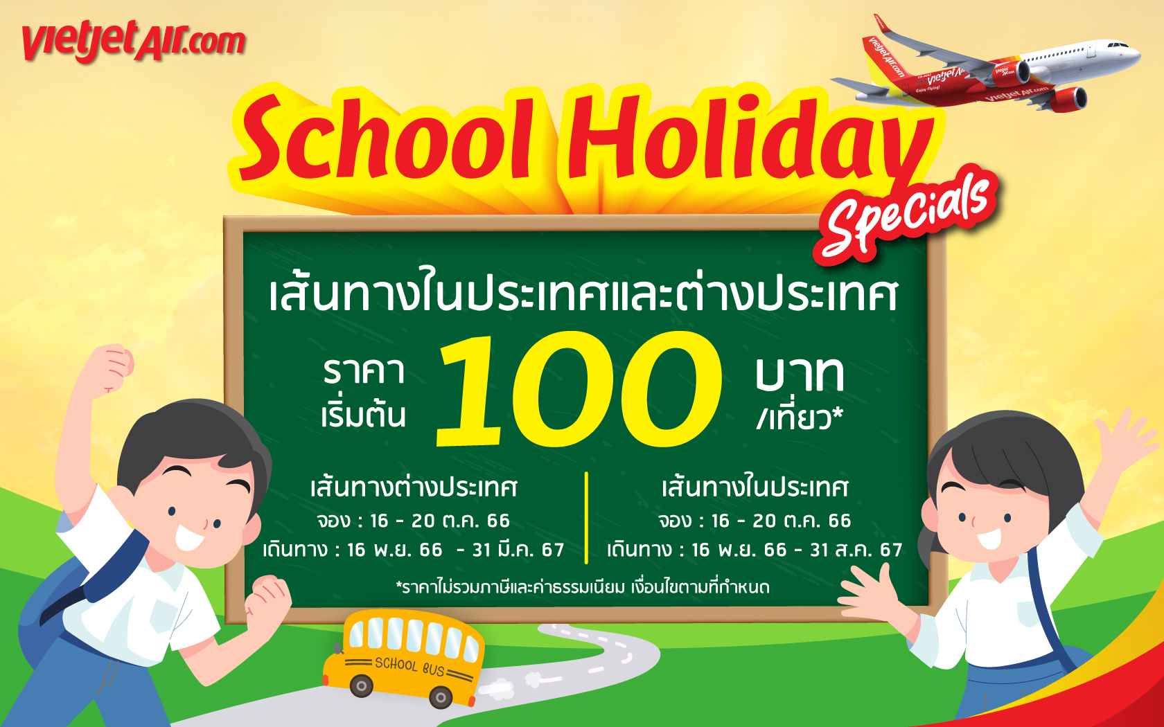 สายการบินไทยเวียตเจ็ทออกโปรโมชั่นต้อนรับปิดเทอม “School Holiday Specials” เสนอบัตรโดยสารราคาพิเศษ เริ่มต้นเพียง 100 บาท (ราคาไม่รวมภาษีและค่าธรรมเนียม) สำหรับเดินทางบนเครือข่ายเส้นทางบินภายในประเทศของไทยเวียตเจ็ท สำรองบัตรโดยสารได้ระหว่างวันที่ 16 – 20 ตุลาคม 2566 และใช้เดินทางได้ระหว่างวันที่ 16 พฤศจิกายน 2566 – 31 มีนาคม 2567 และบัตรโดยสารสำหรับเส้นทางบินระหว่างประเทศใช้เดินทางได้ระหว่างวันที่ 16 พฤศจิกายน 2566 – 31 สิงหาคม 2567 (ยกเว้นวันหยุดนักขัตฤกษ์)