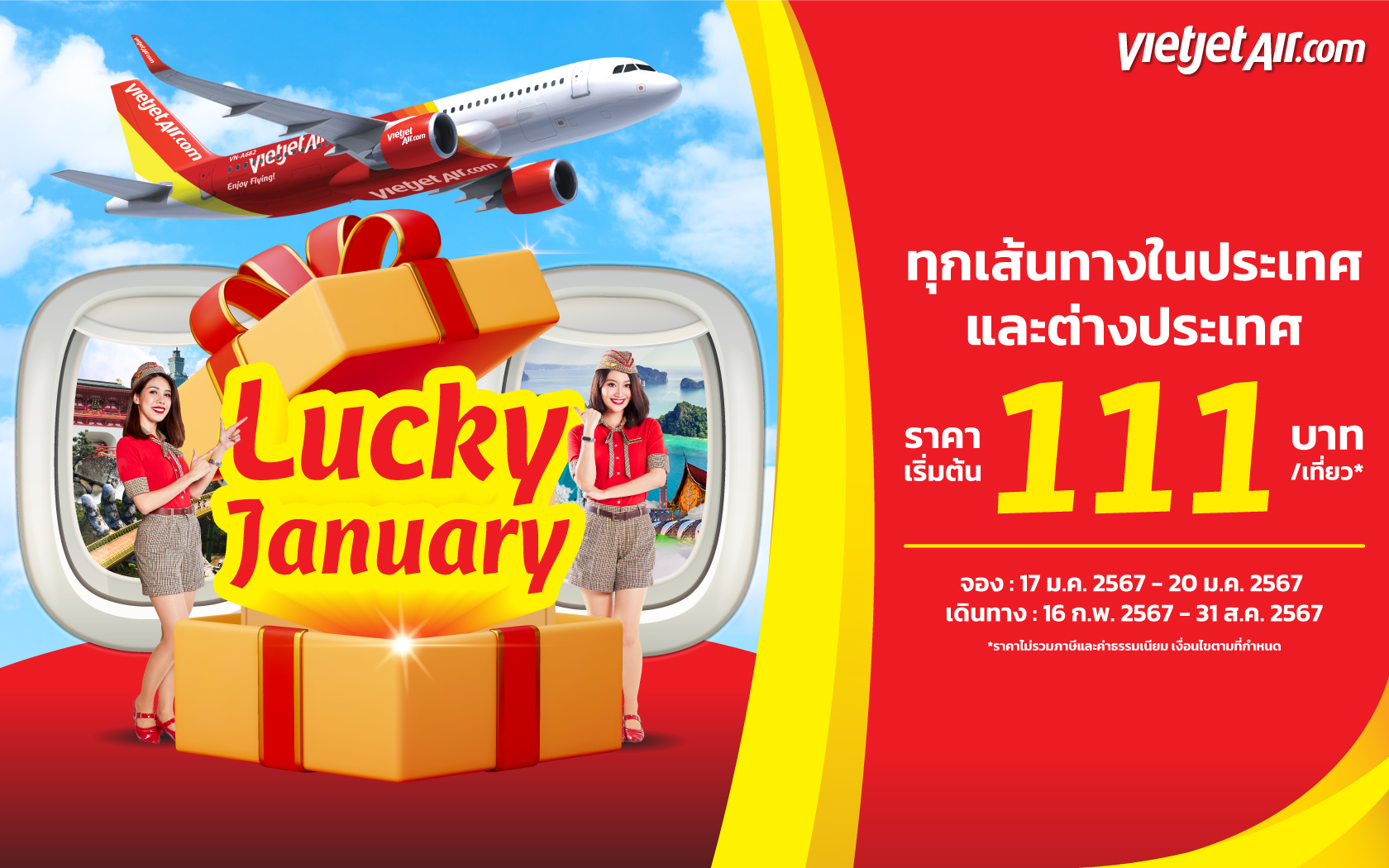 สายการบินไทยเวียตเจ็ทออกโปรโมชั่น “Lucky January” เสนอบัตรโดยสารราคาโปรโมชั่น เริ่มต้นเพียง 111 บาท (ราคาไม่รวมภาษีและค่าธรรมเนียม) สำหรับเดินทางบนเครือข่ายเส้นทางบินภายในประเทศและระหว่างประเทศของไทยเวียตเจ็ท สามารถสำรองบัตรโดยสารได้ระหว่างวันที่ 17–20 มกราคม 2567 ใช้เดินทางได้ระหว่างวันที่ 16 กุมภาพันธ์–31 สิงหาคม 2567 (ยกเว้นวันหยุดนักขัตฤกษ์) ที่ www.vietjetair.com