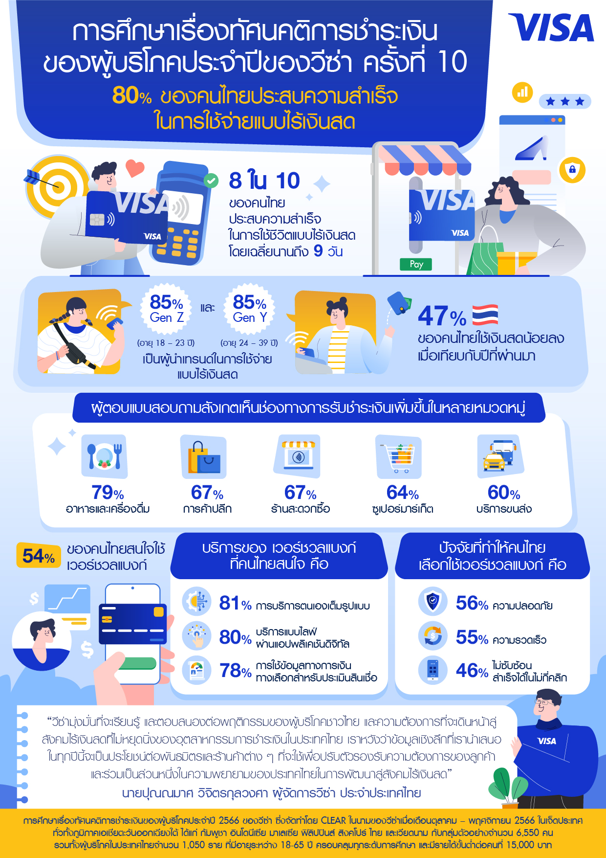 การศึกษาของวีซ่ายังชี้ให้เห็นถึงเทรนด์การใช้จ่ายแบบไร้เงินสดที่ยังคงเดินหน้าอย่างแข็งแกร่งในประเทศไทย โดยพบว่ามากถึงแปดในสิบของผู้บริโภค (81%) พยายามจะใช้จ่ายโดยไม่พึ่งพาเงินสด โดยผู้นำเทรนด์เป็นผู้บริโภคจากกลุ่มเจน Z (85%) [อายุระหว่าง 18 ถึง 23 ปี] และเจน Y (85%) [อายุระหว่าง 24 ถึง 39 ปี]  นอกจากนี้ และเมื่อพูดถึงความสำเร็จในการใช้ชีวิตแบบไร้เงินสดก็พบว่าเกือบสี่ในห้าของชาวไทยสามารถทำได้จริงในชีวิตประจำวัน