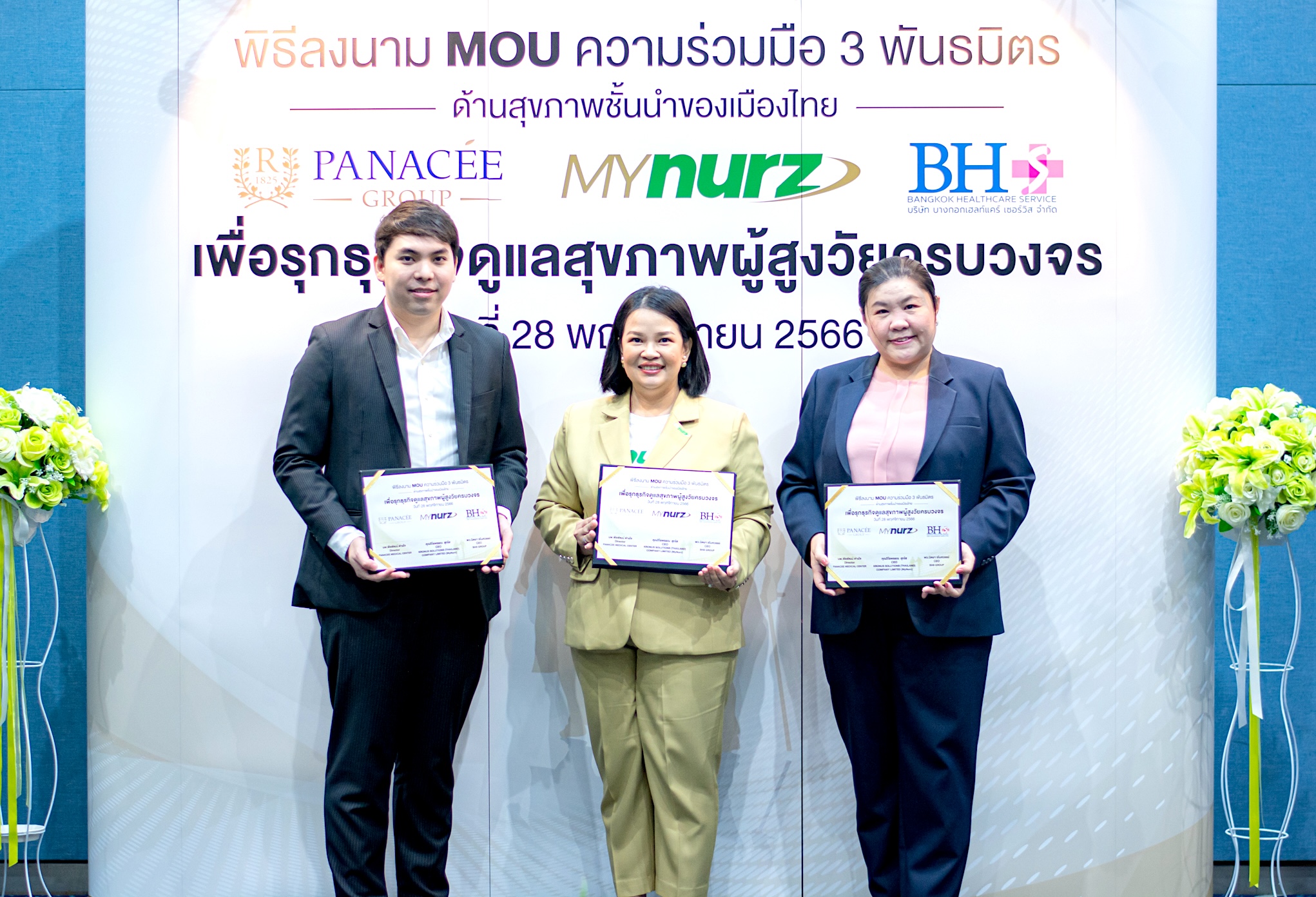 บางกอก เฮลท์แคร์เซอร์วิส ผู้นำ Nursing Home จับมือ Mynurz ผู้นำ Nursing Care และ Panacee Group ผู้นำ Wellness มาตรฐานเยอรมนี สร้าง ecosystem ดูแล รักษา ฟื้นฟู ครบวงจร พลิกโฉมมาตรฐานการดูแลผู้ป่วยครบวงจรรายแรกของประเทศไทย เปิดตลาดWellness เชิงรักษา ในกลุ่มผู้ป่วยสีเหลืองและสีแดง มูลค่าตลาดกว่า 30,000 ล้านบาท รับสังคมผู้สูงอายุ คนไทยอายุยืนขึ้น แต่กลับป่วยด้วยโรค NCDs ในกลุ่มคนอายุน้อยลง ตั้งเป้าหมายฟื้นฟูผู้ป่วยกลุ่มคนทำงานกลับสู่สังคม เพื่อกำลังขับสำคัญขับเคลื่อนเศรษฐกิจประเทศ