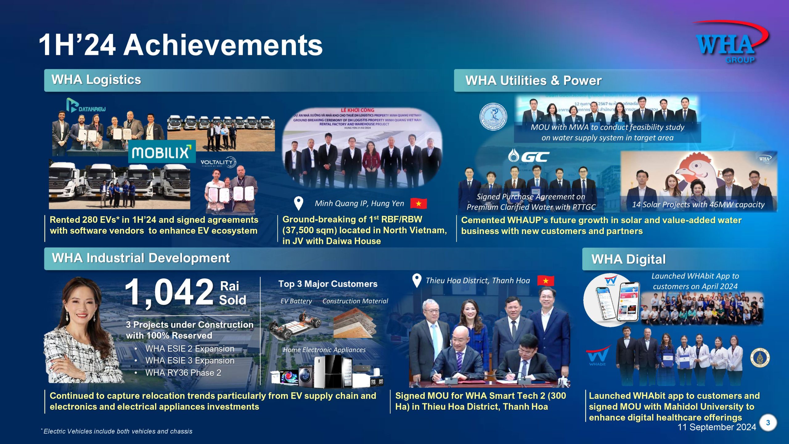 WHA Group มั่นใจผลการดำเนินงานครึ่งหลังของปี 2567 เติบโตต่อเนื่อง รายได้รวม และส่วนแบ่งกำไรของกลุ่มบริษัทฯ ทะลุ 15,000 ล้านบาท อัตรากำไรก่อนดอกเบี้ย ภาษีเงินได้ ค่าเสื่อมราคา และค่าตัดจัดหน่าย (EBITDA) สูงกว่า 50% เดินหน้าสู่ความเป็นองค์กรที่ขับเคลื่อนด้วยเทคโนโลยีเพื่อความยั่งยืนในทุกมิติ พร้อมเป้าหมายการเติบโตอย่างต่อเนื่อง โดยมุ่งเน้นการขยายธุรกิจทั้งในประเทศและต่างประเทศ เสริมสร้างศักยภาพ และขอบข่ายบริการโมบิลิกส์ (Mobilix) ธุรกิจโซลูชันกรีนโลจิสติกส์ นับเป็นการปฏิวัติการขนส่งสู่ความยั่งยืนด้วยระบบนิเวศยานยนต์ไฟฟ้าแบบครบวงจร โครงการพลังงานหมุนเวียน การนำเทคโนโลยีดิจิทัล และ AI มาใช้เพื่อเพิ่มประสิทธิภาพในการดำเนินงานในทุกมิติ และมุ่งพัฒนานวัตกรรมผลิตภัณฑ์และบริการใหม่ๆ ตลอดจนการขยายความร่วมมือกับพันธมิตรเชิงกลยุทธ์สอดคล้องกับพันธกิจ WHA: WE SHAPE THE FUTURE ในการสร้าง สังคม สิ่งแวดล้อม ตลอดจนการพัฒนาประเทศ