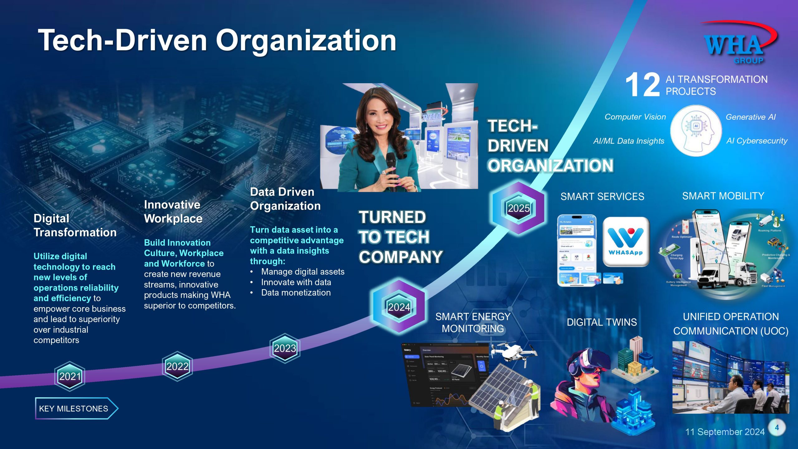 นางสาวจรีพร จารุกรสกุล ประธานคณะกรรมการบริหารและประธานเจ้าหน้าที่บริหารกลุ่ม บริษัท ดับบลิวเอชเอ คอร์ปอเรชั่น จำกัด (มหาชน) หรือ WHA กล่าวว่า “ทิศทางธุรกิจภาครวมในช่วงไตรมาส 4 และภาพรวมครึ่งหลังปี 2567 ของเรามีแนวโน้มที่แข็งแกร่ง ด้วยการมุ่งเดินหน้าตามกลยุทธ์และพัฒนาแนวทางธุรกิจให้สอดคล้องกับเมกะเทรนด์โลก โดยเฉพาะการย้ายฐานการผลิตและลงทุนสู่ภูมิภาคเอเชียตะวันออกเฉียงใต้ การนำเทคโนโลยีมาปรับใช้ รวมถึงการดำเนินงานด้านความยั่งยืนอย่างต่อเนื่อง ปีนี้ WHA Group ได้พิสูจน์ให้เห็นถึงความสำเร็จของการปฏิวัติองค์กรด้วยการก้าวสู่การเป็น Tech & Sustainable Company เต็มรูปแบบ จากจุดเริ่มต้นในปีพ.ศ. 2564 ที่ได้ริเริ่มโครงการ Digital Transformation สร้างวัฒนธรรมองค์กรแห่งนวัตกรรม เพื่อยกระดับประสิทธิภาพในการดำเนินงาน เสริมศักยภาพธุรกิจให้ก้าวขึ้นเหนือคู่แข่ง จากนั้นได้พัฒนาสู่การเป็นองค์กรที่ขับเคลื่อนด้วยข้อมูล พร้อมวางเป้าหมายก้าวสู่การเป็นองค์กรที่ขับเคลื่อนด้วยเทคโนโลยี (Tech-Driven Organization) ในทุกมิติภายในปี 2568”