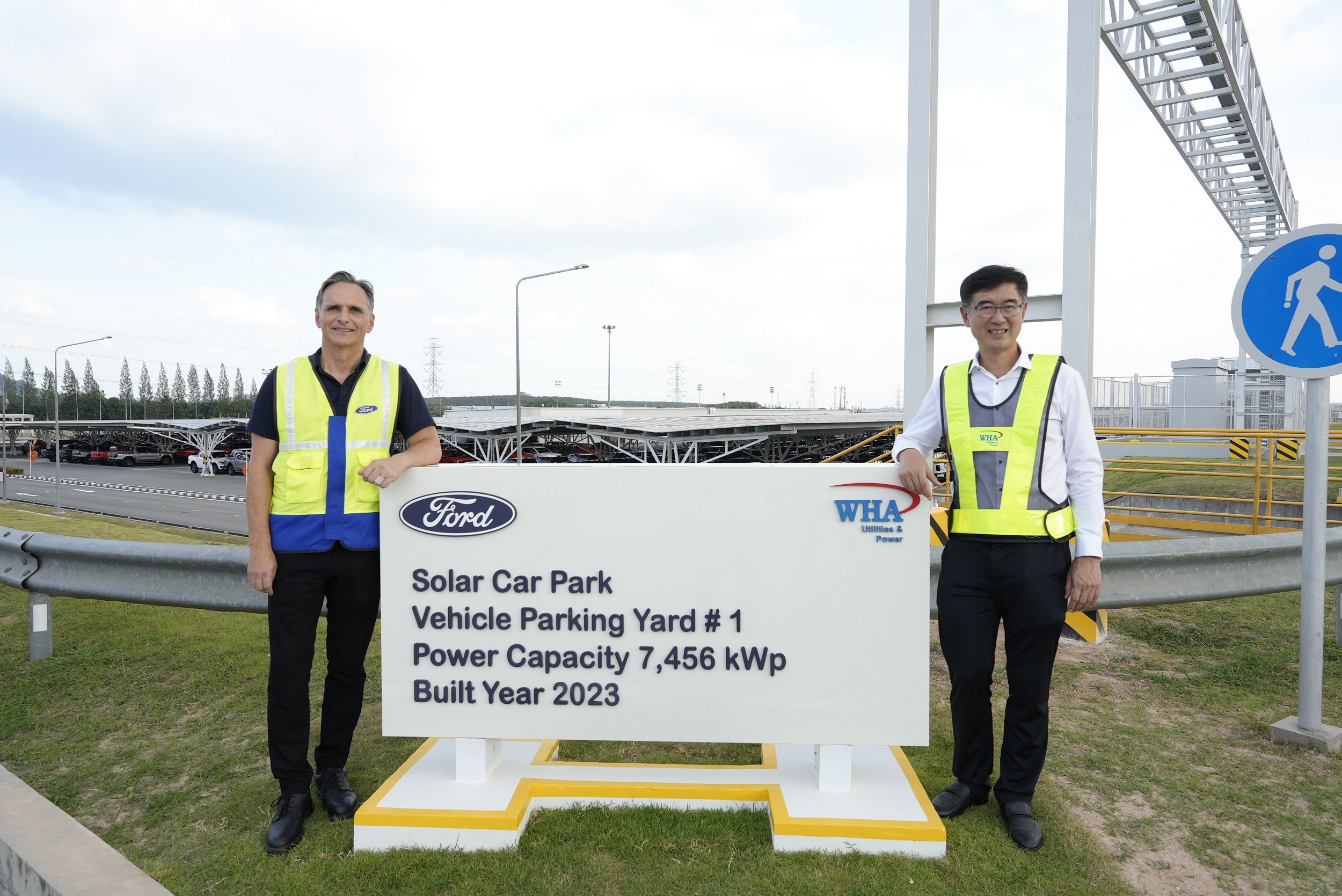 นายสมเกียรติ เมสันธสุวรรณ (ด้านขวา) ประธานเจ้าหน้าที่บริหาร บมจ.ดับบลิวเอชเอ ยูทิลิตี้ส์ แอนด์ พาวเวอร์ (“WHAUP”) และ มร. วินโค้ ซาริค (ด้านซ้าย)ผู้จัดการโรงงาน ฟอร์ด ไทยแลนด์ แมนูแฟคเจอริ่ง เยี่ยมชมและตรวจความพร้อมของโครงการติดตั้งระบบผลิตไฟฟ้าจากพลังงานแสงอาทิตย์บนหลังคาที่จอดรถ (Solar Carpark) มีขนาดพื้นที่ 59,000 ตารางเมตร หรือคิดเป็นกำลังผลิตไฟฟ้ารวม 7.7 เมกะวัตต์ ซึ่งมีขนาดใหญ่ที่สุดในประเทศไทย ตั้งอยู่ในนิคมอุตสาหกรรมดับบลิวเอชเอ อีสเทิร์นซีบอร์ด 1 โดยโครงการดังกล่าวพร้อมดำเนินการจำหน่ายกระแสไฟฟ้าเข้าระบบเชิงพาณิชย์ (COD) ในปี 2567
