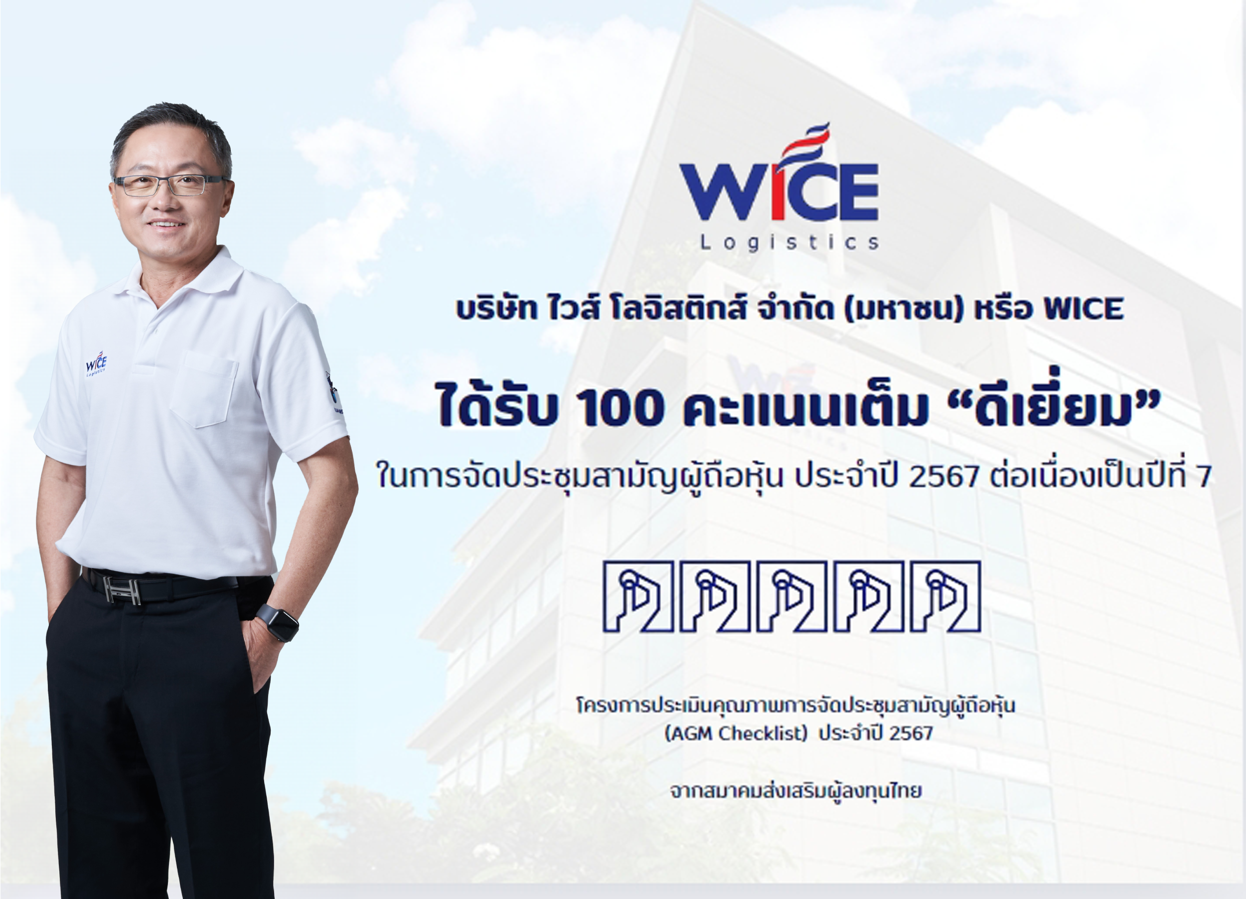 นายชูเดช คงสุนทร กรรมการผู้จัดการฝ่ายพัฒนาธุรกิจ บริษัท ไวส์ โลจิสติกส์ จำกัด (มหาชน) หรือ WICE เปิดเผยว่า “นับเป็นเรื่องที่น่ายินดีอย่างยิ่ง ที่บริษัทฯ ได้รับคะแนนประเมินการจัดประชุมผู้ถือหุ้น 100 คะแนนเต็มหรือ “ดีเยี่ยม สมควรเป็นตัวอย่าง” ต่อเนื่องเป็นปีที่ 7 ติดต่อกัน จากบริษัทจดทะเบียนที่เข้าร่วมโครงการทั้งสิ้น 808 บริษัท สะท้อนให้เห็นถึงเจตนารมณ์ในการดำเนินธุรกิจภายใต้หลักจริยธรรมในการประกอบธุรกิจ และแนวทางการกำกับดูแลกิจการที่ดี ควบคู่ไปกับมีความรับผิดชอบต่อสังคม ชุมชน สิ่งแวดล้อม และผู้มีส่วนได้เสียทุกฝ่าย