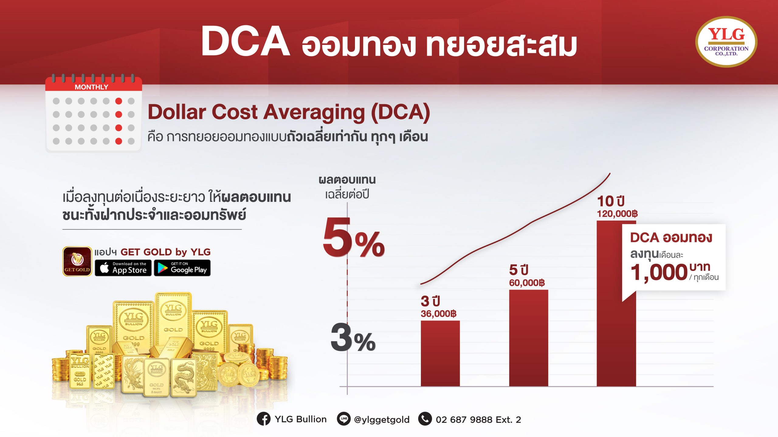 อย่างไรก็ดีสำหรับนักลงทุนที่ต้องการซื้อเพื่อสะสมในระยะยาวนั้นวายแอลจีแนะนำการลงทุนที่น่าสนใจอีกวิธีหนึ่ง คือการลงทุนสะสมแบบถัวเฉลี่ยต้นทุน (DCA) ซึ่งเป็นวิธีที่จะทำให้นักลงทุนสามารถสร้างวินัยการออม และเข้าถึงราคาทองได้หลากหลาย อีกทั้งปัจจุบันยังสามารถตั้งเวลาซื้อล่วงหน้าได้อีกด้วย สำหรับนักลงทุนมือใหม่วายแอลจีแนะนำแอปพลิเคชัน Get Gold by YLG ที่เปิดโอกาสให้เริ่มสะสมด้วยเงินลงทุนเพียง 100 บาท ซึ่งได้รับการตอบรับเป็นอย่างดี และตอบโจทย์การลงทุนของคนรุ่นใหม่ที่สามารถซื้อ-ขายทองคำ Gold Spot แบบเรียลไทม์ 24 ชั่วโมงเข้าถึงง่ายด้วยสมาร์ตโฟน และมีความน่าเชื่อถือ ด้านความปลอดภัย สามารถทำกำไรได้จริง ผู้สมัครสามารถยืนยันตัวตนพร้อมยื่นเอกสารผ่านแอปพลิเคชั่น รู้ผลอนุมัติได้ภายในวันเดียว และสามารถทำการซื้อ-ขาย ทองคำได้ทันที เปิดให้ลงทุนเริ่มต้นที่ 100 บาท จนถึง 80 กิโลกรัมต่อ 1 วัน